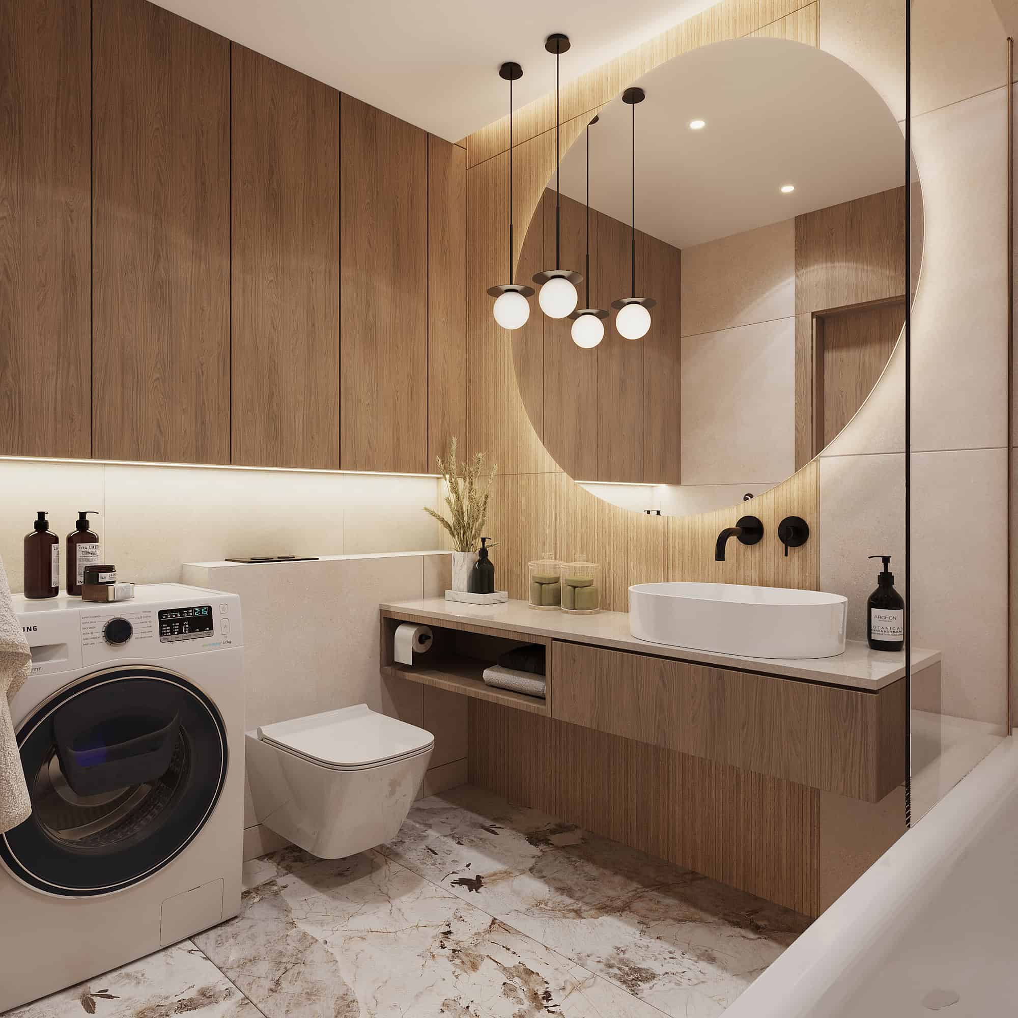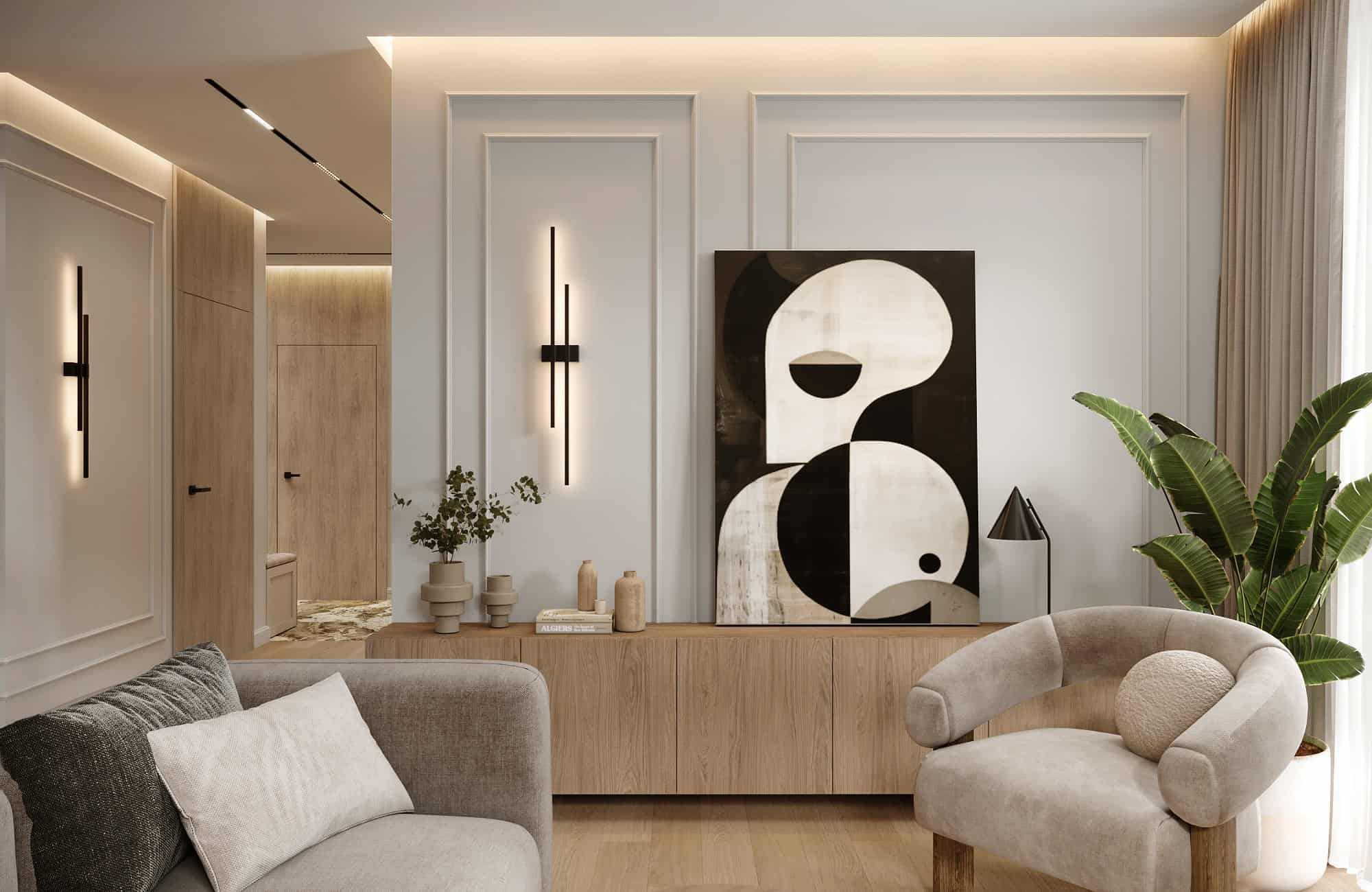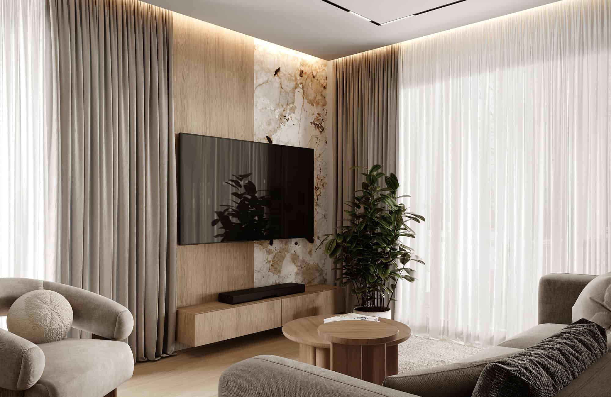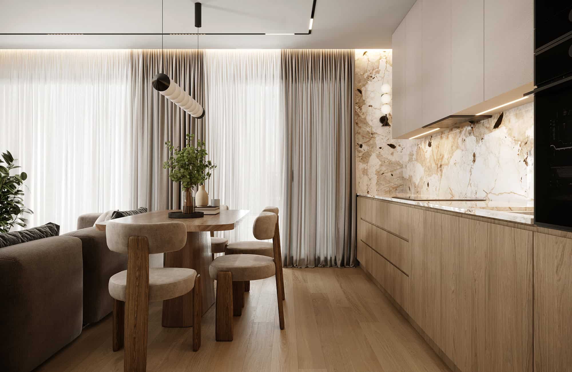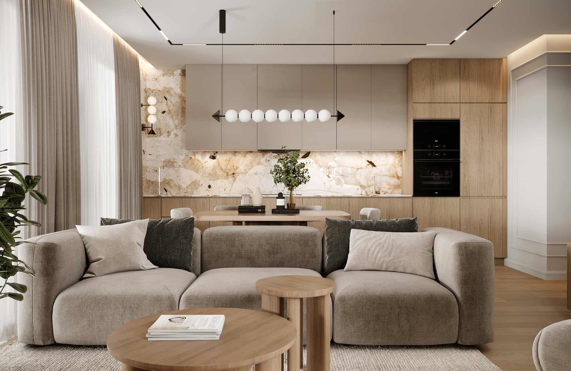 Projekt przytulnego mieszkania w jasnych kolorach, którego motywem przewodnim jest płytka Patagonia. Wnętrza ociepliliśmy stosując dużą ilość drewna oraz beżu. Elegancji dodają delikatne sztukaterie ścienne . Dla kontrastu zastosowaliśmy czarne elementy takie jak np. lampy, które przyciągają wzrok swoją ciekawą formą.