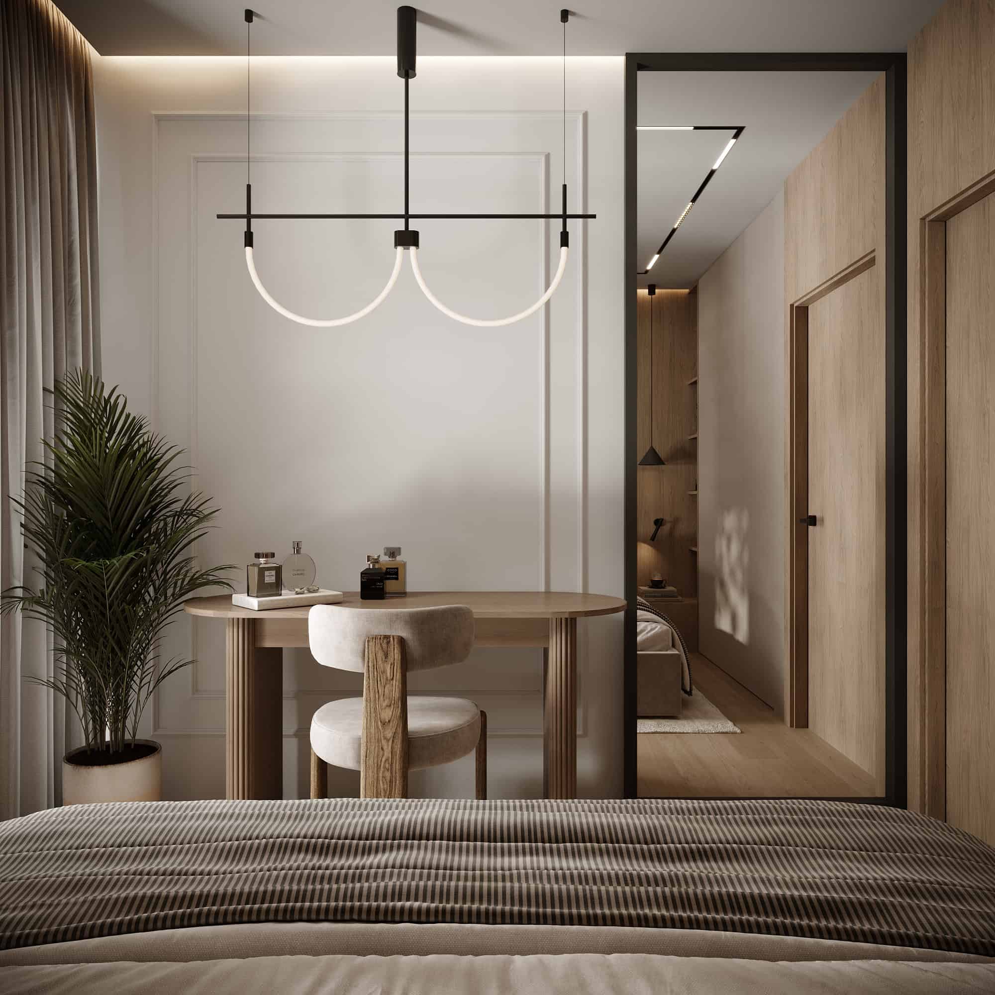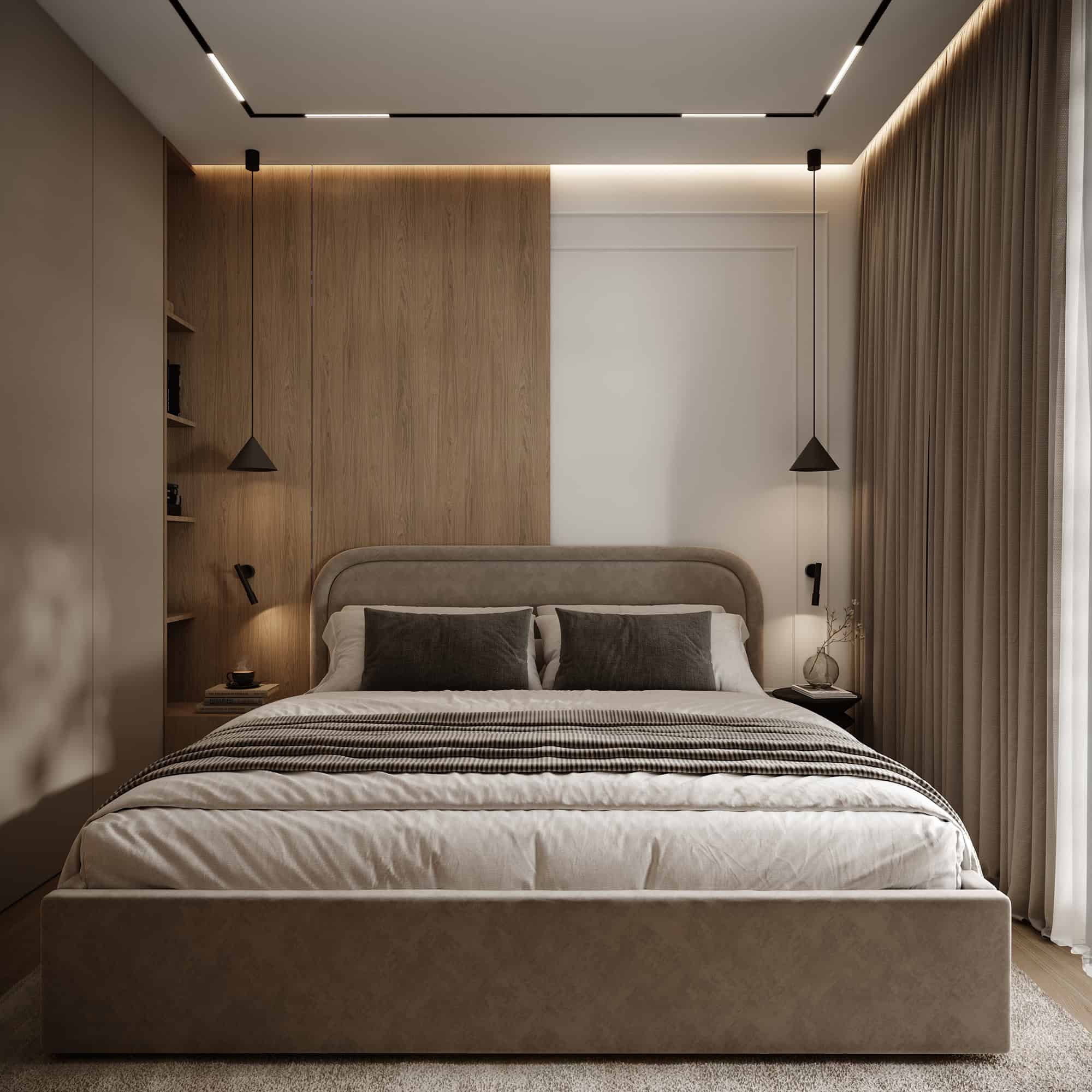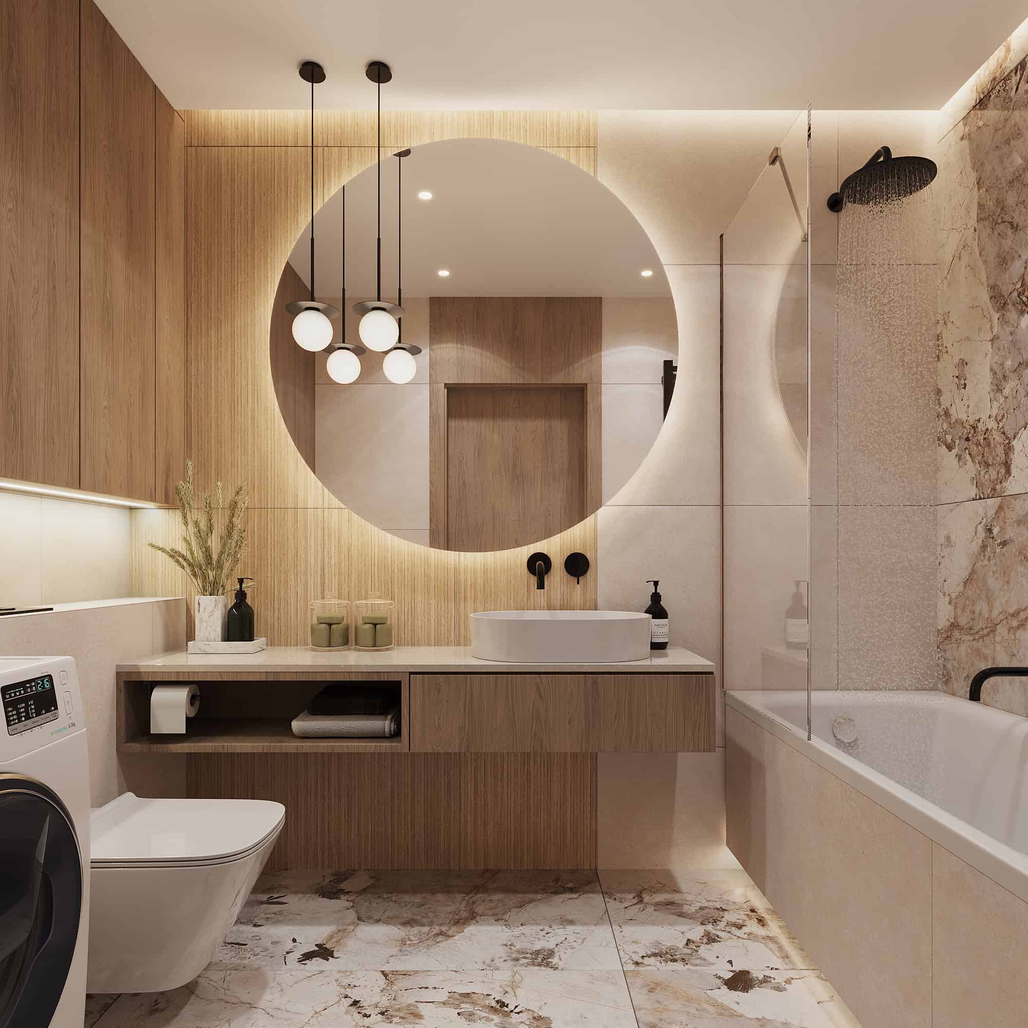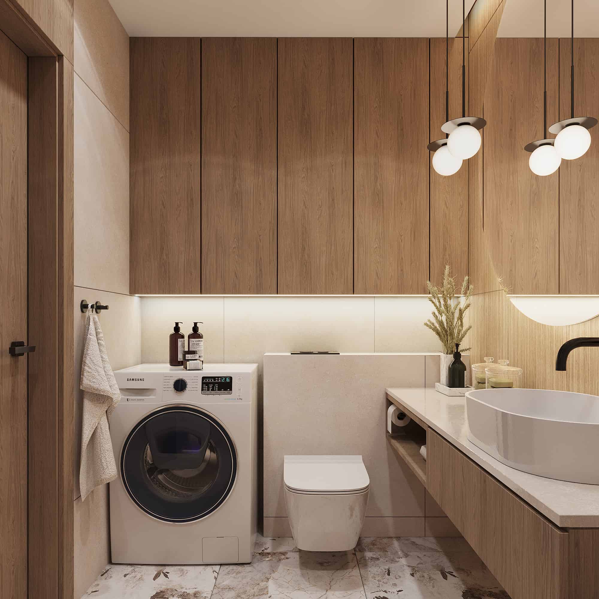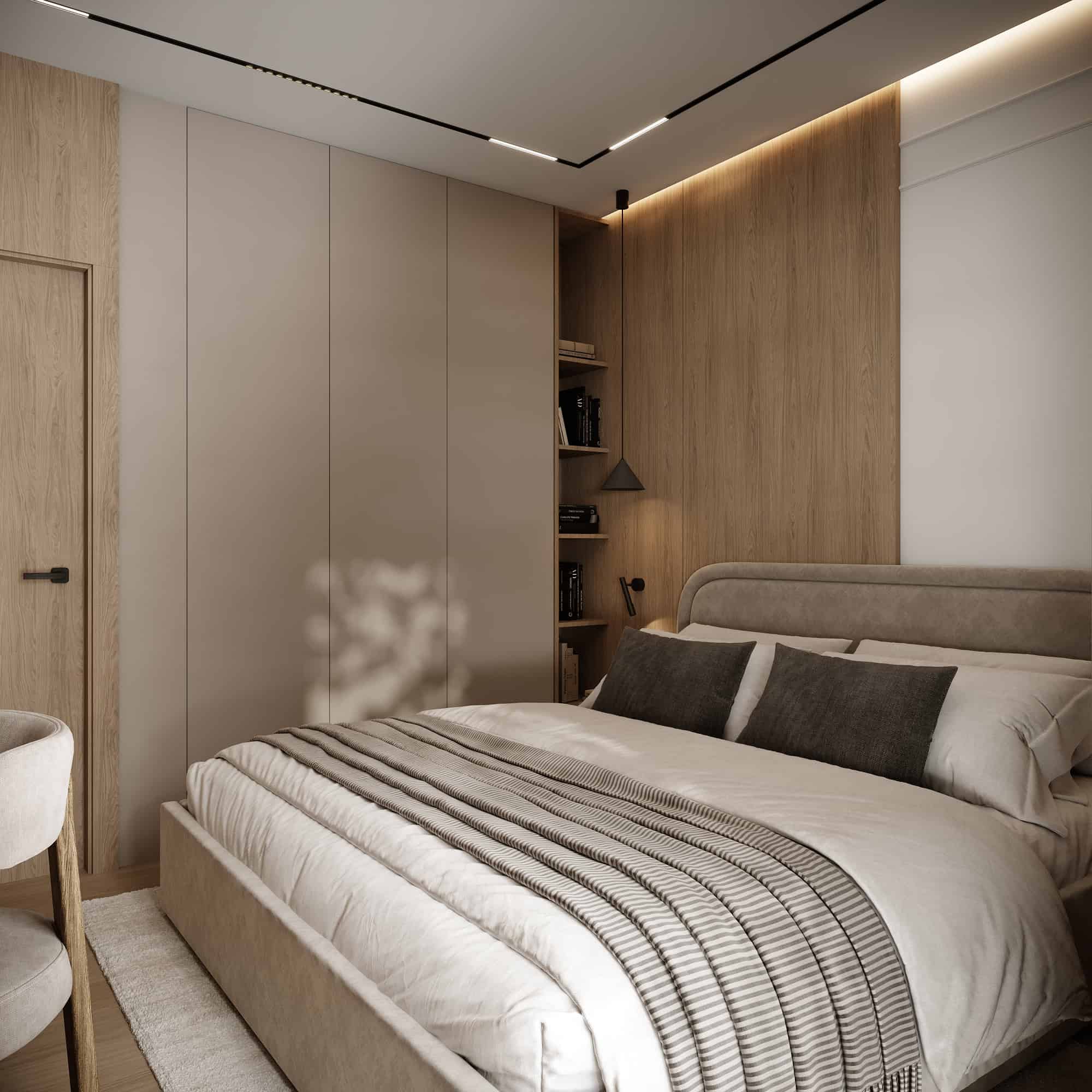 Projekt przytulnego mieszkania w jasnych kolorach, którego motywem przewodnim jest płytka Patagonia. Wnętrza ociepliliśmy stosując dużą ilość drewna oraz beżu. Elegancji dodają delikatne sztukaterie ścienne . Dla kontrastu zastosowaliśmy czarne elementy takie jak np. lampy, które przyciągają wzrok swoją ciekawą formą.