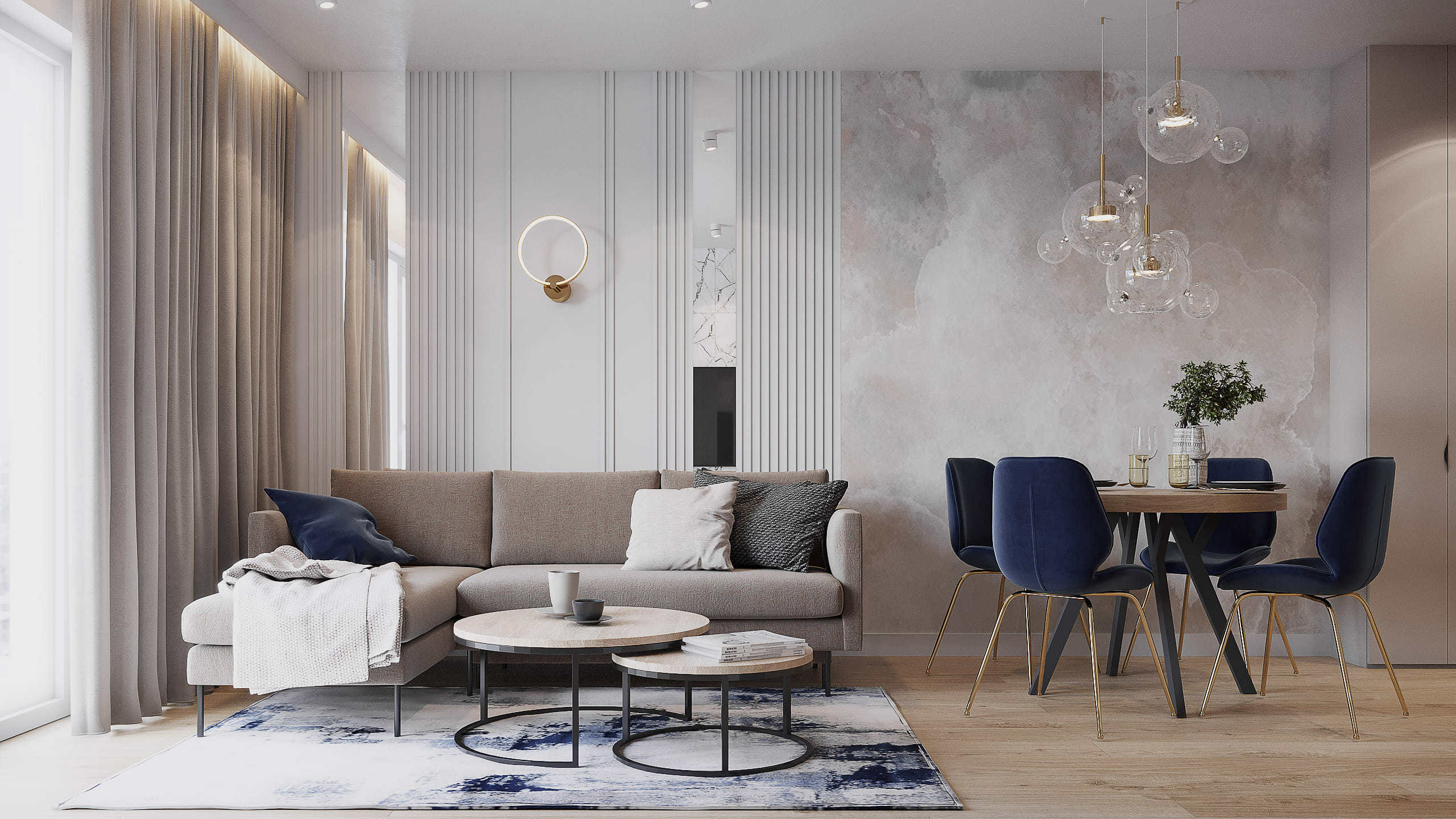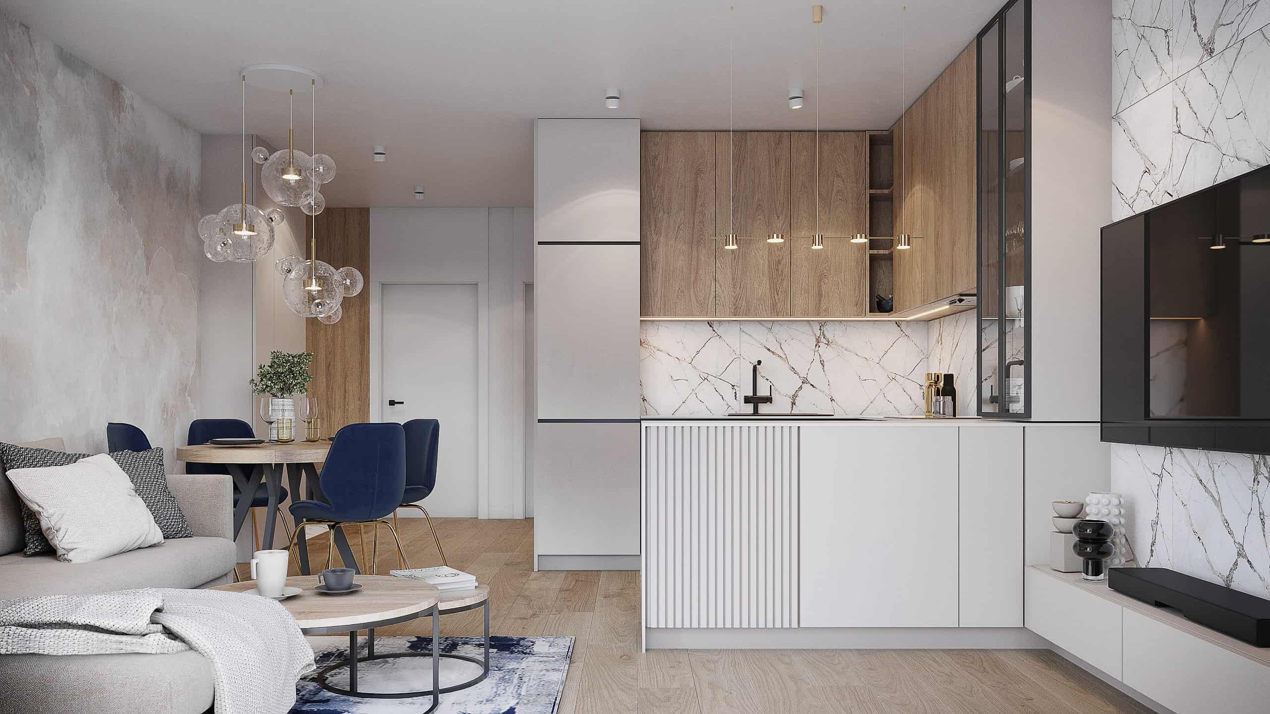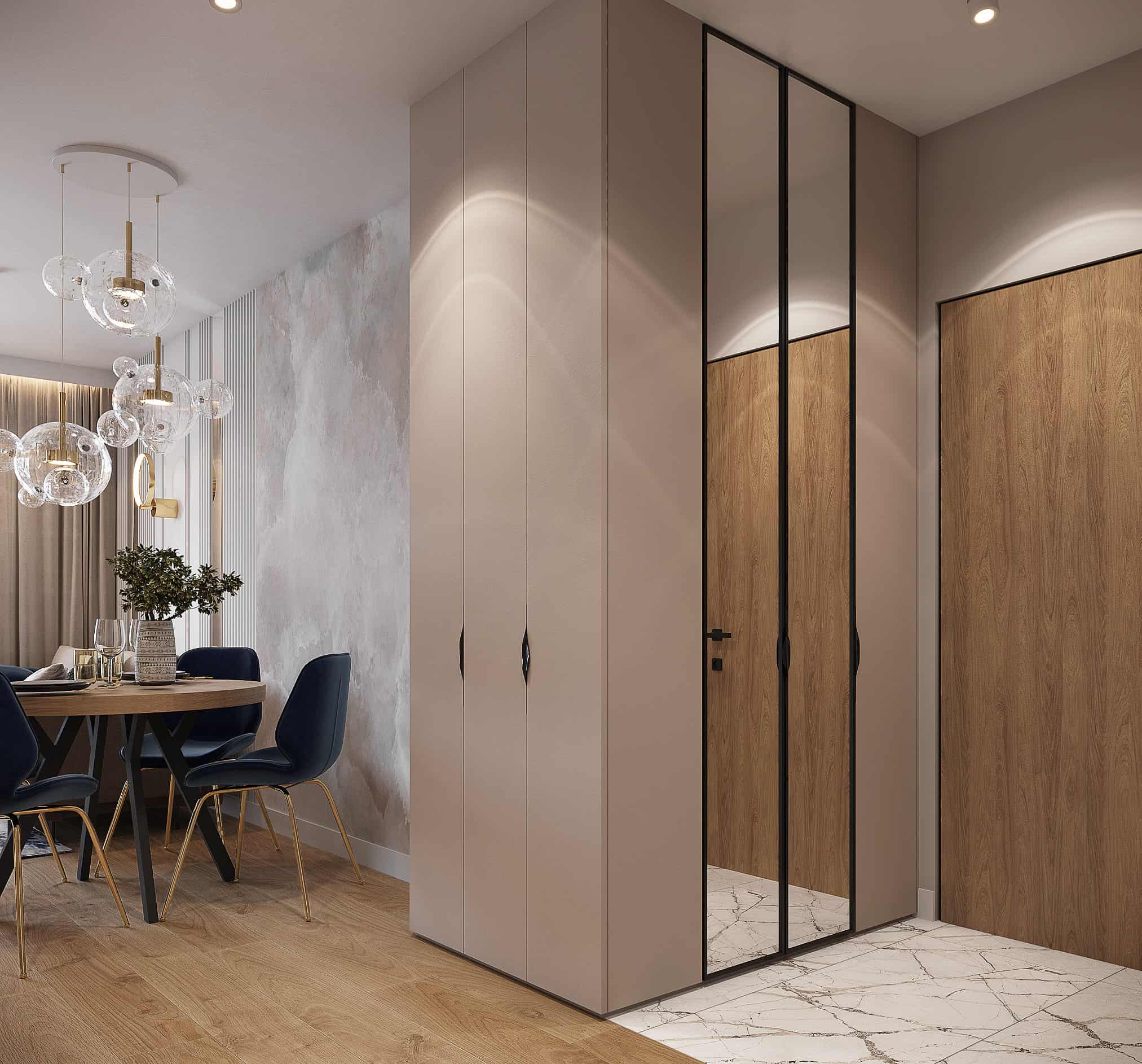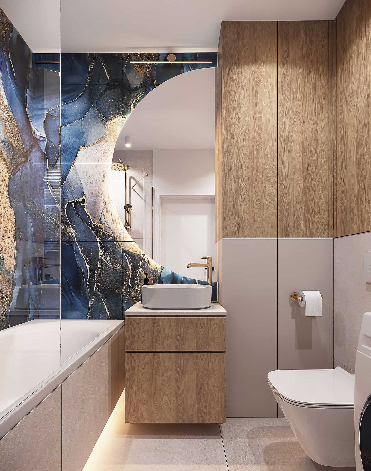 W tym projekcie mieszkania na krakowskich Czyżynach do beżowej bazy dodaliśmy ciekawe tapety z elementami niebieskiego, granatowego oraz złote dodatki. Elegancji dodają również płytki z rysunkiem marmuru.
