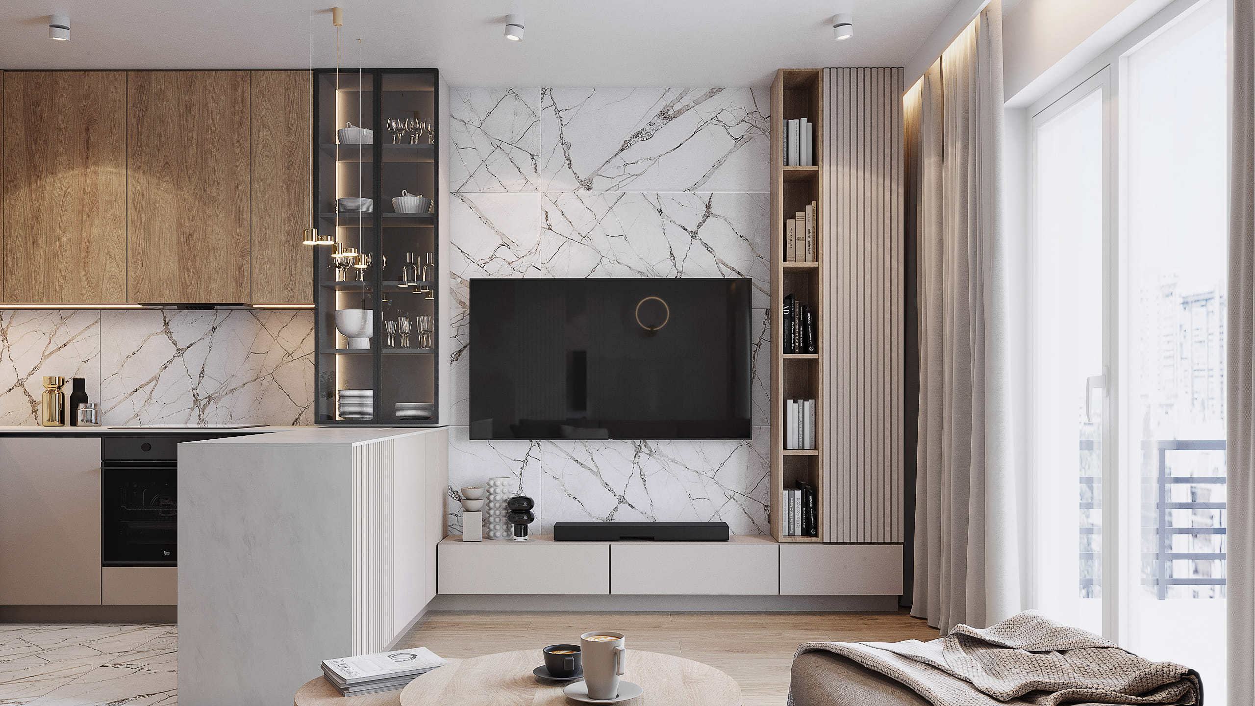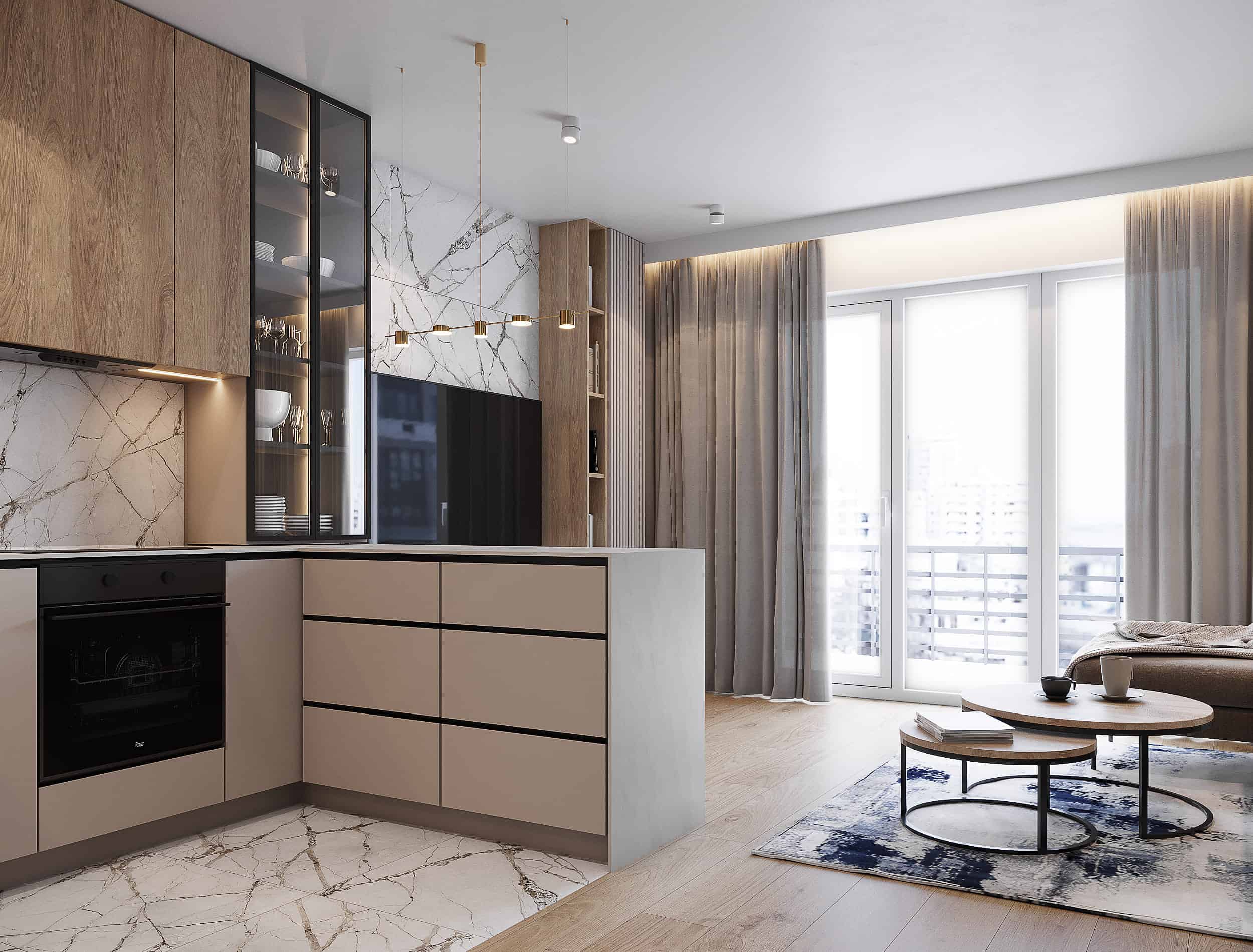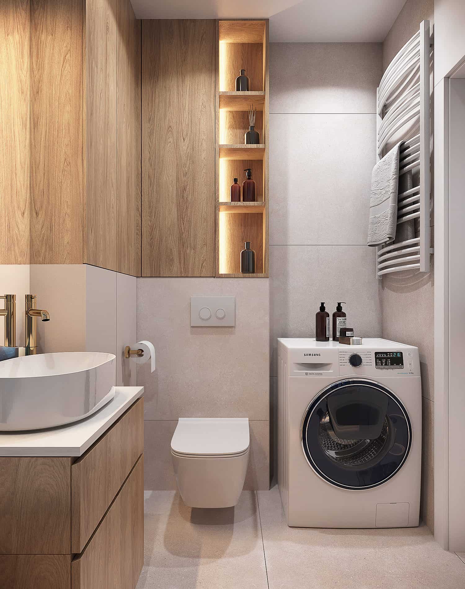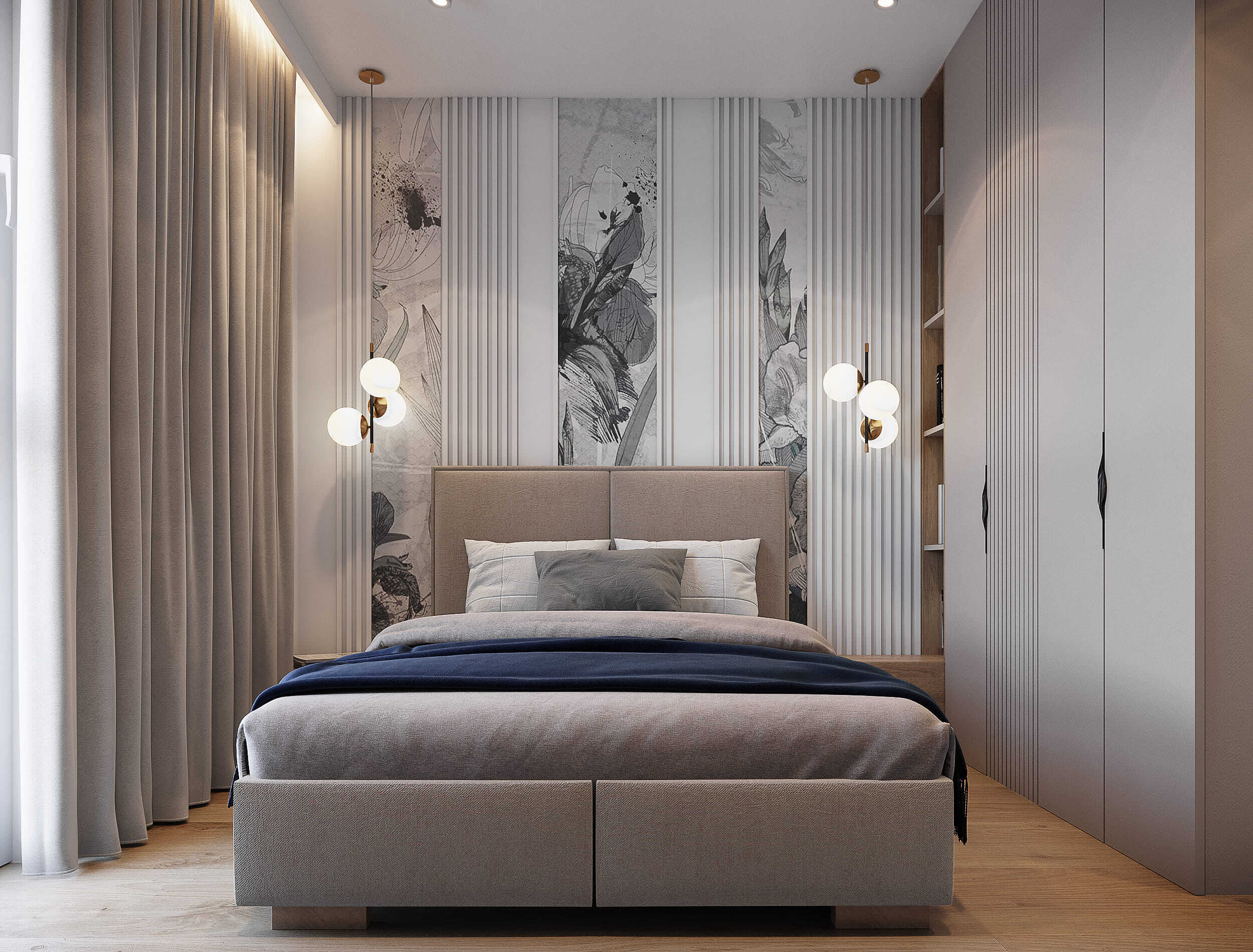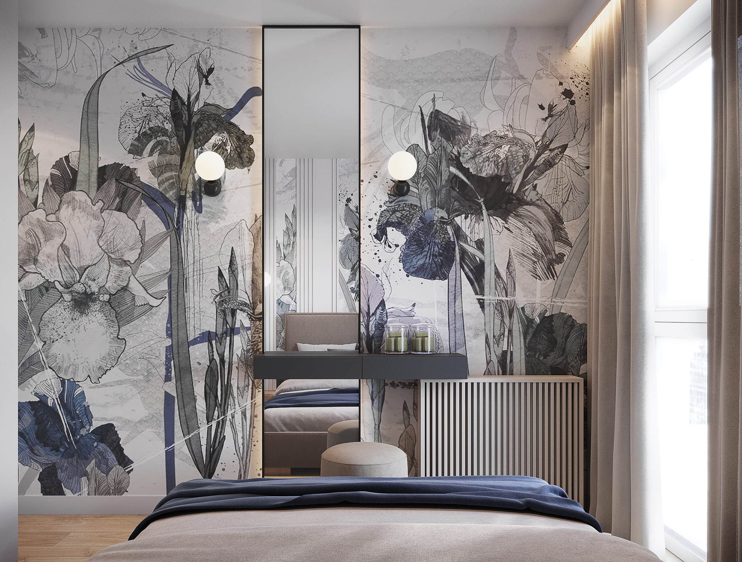 W tym projekcie mieszkania na krakowskich Czyżynach do beżowej bazy dodaliśmy ciekawe tapety z elementami niebieskiego, granatowego oraz złote dodatki. Elegancji dodają również płytki z rysunkiem marmuru.